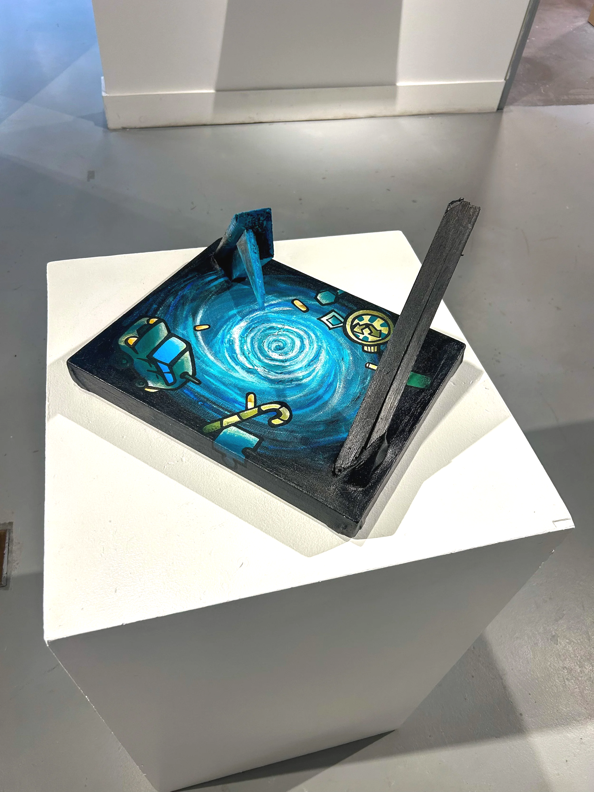 Building on these ideas, I created Spiral—a repurposed work composed of past students’ stretcher bars and an “unfinished” painting featuring the same spiral motif. Pulling from my first-year allegory painting, Spiraling Out of Control, I layered imagery from that piece onto the “unfinished painting.” Through these interwoven layers of reuse and transformation, Spiral embodies the evolution of our past selves, showing how traces of former creations continue to shape and sustain our present artistic identities.”